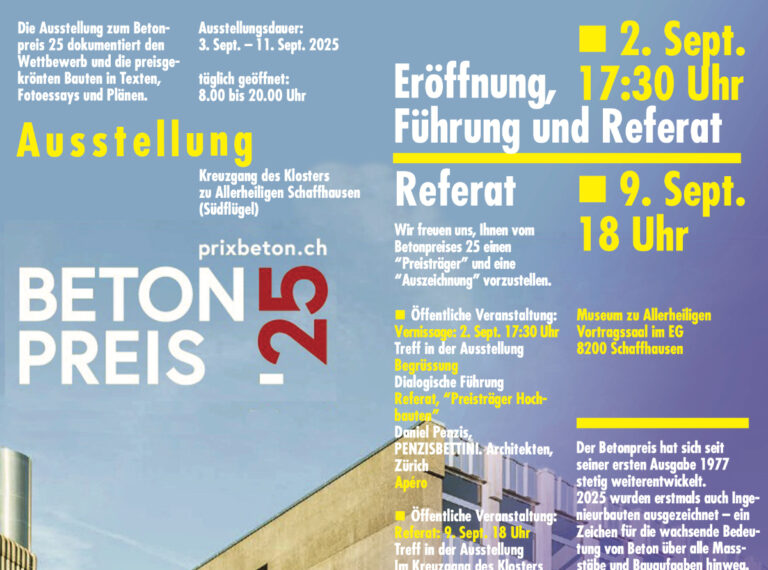 Die Wanderausstellung zum Betonpreis 2025 tourt durch die Schweiz und macht Halt in Schaffhausen. Die Ausstellung zeigt hervorragende Projekte, bei denen Beton gezielt, klug und gestalterisch überzeugend eingesetzt wurde.