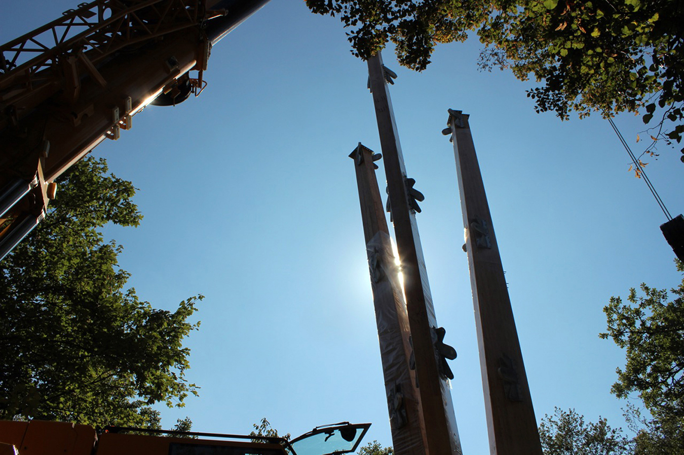 Die drei Träger aus Lärchenholz sind auf erstaunlich kleiner Fläche bereits fest im Boden verankert und fügen sich durch ihre sanfte Neigung in drei Richtungen perfekt in die Umgebung ein. Sie wirken wie natürlich gewachsene Bäume, stehen diskret, fast unsichtbar im Wald. Gleichzeitig aber doch stattlich und imposant. Diese Gegensätze zu vereinen, ist fast ein bisschen Kunst. Gelungen ist es Raoul Müller und Patrick Birri in Zusammenarbeit mit Holzbauingenieur Michael Hübscher. Der steht vor Ort und ist sichtlich angetan von diesem Projekt: Einen Turm baut man ja nicht alle Tage, das ist auch für seine Mitarbeiter etwas Spezielles.
