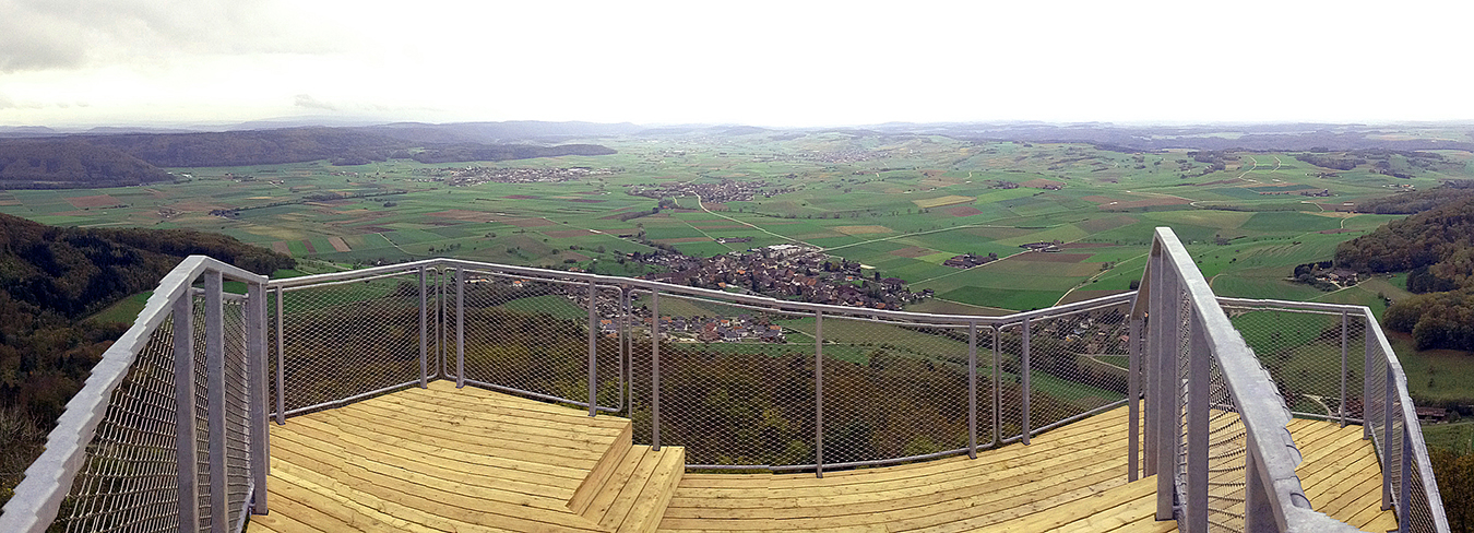 Deshalb wurden Hübschers Ausführungen kurzerhand zum Apéro ins Siblinger Randenhaus verlegt, wo Rieslingsuppe und Wildsauhäppchen beim Aufwärmen halfen. Nach einem kurzen geschichtlichen Exkurs über die verschiedenen Türme auf dem Randen, erläuterte uns Hübscher mit einigem Bildmaterial den Bau „seines“ Turms. So erfuhr man, dass 14 m3 Lärchenholz verbaut wurden. Ökologisch nachhaltig sei das Baumaterial, die CO2-Bilanz hervorragend. Überhaupt sei es eigentlich logisch, einen Holzturm zu bauen: Der Kanton Schaffhausen steht proportional zur Gesamtfläche bezüglich Wald an zweiter Stelle. Nur das Tessin hat noch mehr. Gefragt nach der Dauerhaftigkeit eines Holzturms, meinte Hübscher lachend: „So lange wie möglich!“. Es wurde darauf geachtet, dass das Wasser von den Podesten und hinter den Metallverbindungen gut ablaufen und das Holz immer wieder trocknen kann. Das sei essentiell für eine sehr lange Haltbarkeit. Einzig die Verzinkung der Metallteile habe eine beschränkte Lebensdauer: nach 40 Jahren muss sie erneuert werden. Vorerst kann nun aber die Gemeinde Siblingen ihren neuen Turm, der insgesamt 520’000 Franken gekostet hat, der Bevölkerung übergeben. Am 8. November ist es soweit. Den ganzen Tag finden verschiedene Feierlichkeiten statt.