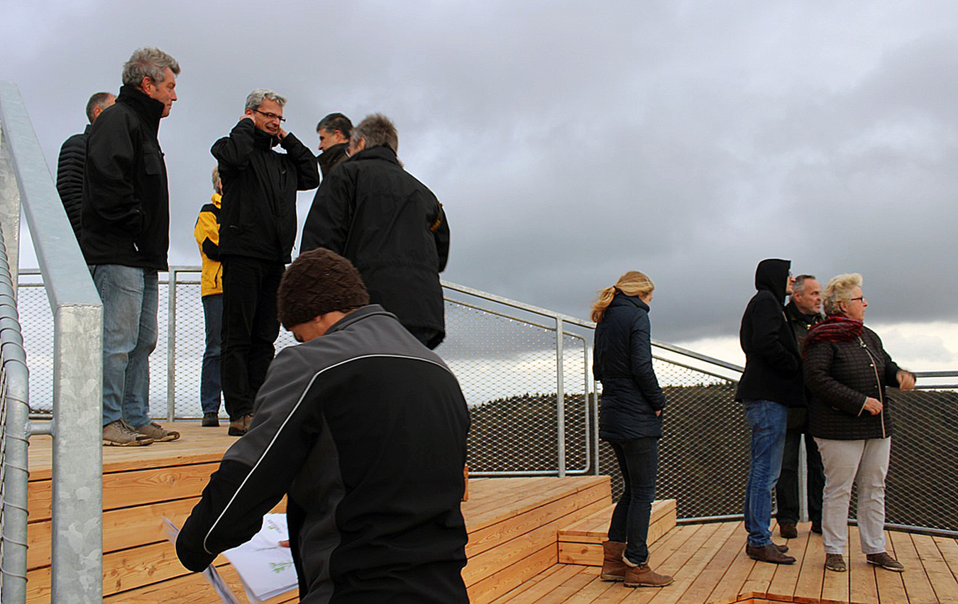 Michael Hübscher, Erbauer und Mit-Autor der Turmgestaltung, stieg allen voran hinauf zur obersten Plattform. Mit der beruhigenden Information, dass das Betonfundament unter der Splittschicht 60 cm stark ist, die Erdanker 12 m tief im Boden stecken, ein Träger inklusive Stahlteile 4.5 Tonnen wiegt und es 3 Blitzableiter gibt, genossen alle diesen ersten Aufstieg und die brilliante Aussicht. Mit einer Nutzlast von 3kN/m2 könnten 99 Personen auf dem Turm stehen. Die gestuften Sitzgelegenheiten zuoberst auf der Aussichtsplattform machen die Rundumsicht zur Bühnenszenerie und laden zum Verweilen. Leider nicht an dem Abend – es war schlicht zu kalt.