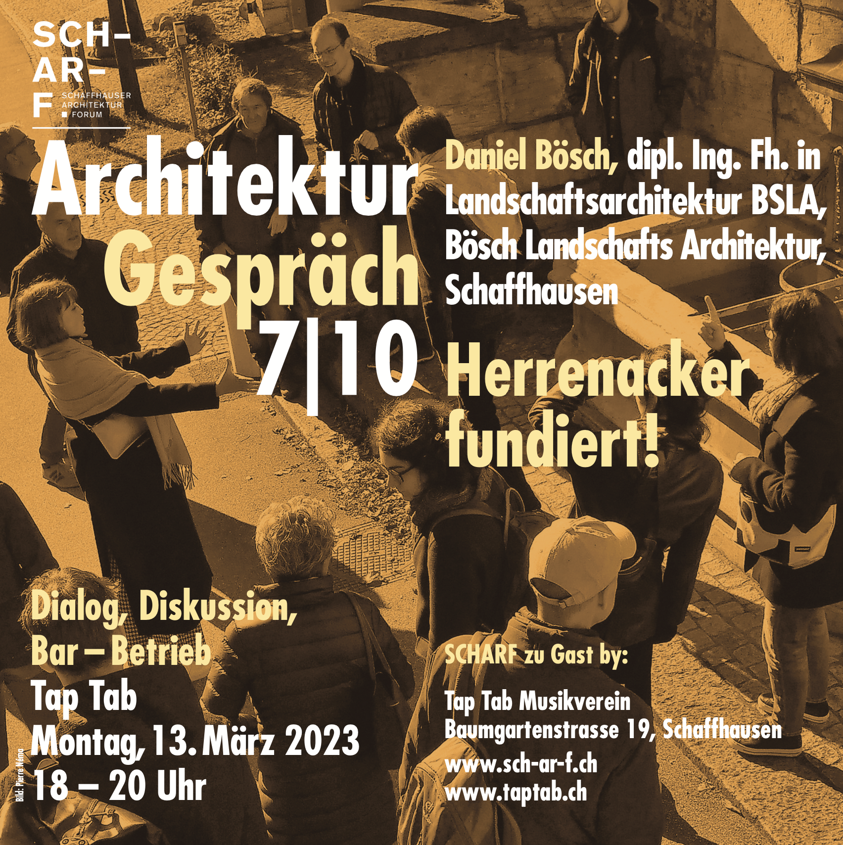Das Schaffhauser Architektur Forum veranstaltet von September 2022 bis Juni 2023 eine monatliche Gesprächsreihe über Architektur, Städtebau und Baukultur im TapTab. Beispiele aktueller, öffentlich interessanter Projekte werden im Dialog pointiert und transparent veranschaulicht und zeigen die Haltung und das Verständnis der eingeladenen Fachpersonen in Bezug zum vieldiskutierten Qualitätsbegriff.