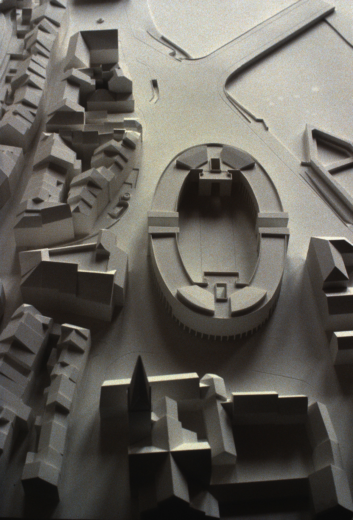 ↑ Ungebaut – Strickmaschinen Areal (Luigi Snozzi, Bruno Jenni), Schaffhausen 1984, Photo Christian Wäckerlin