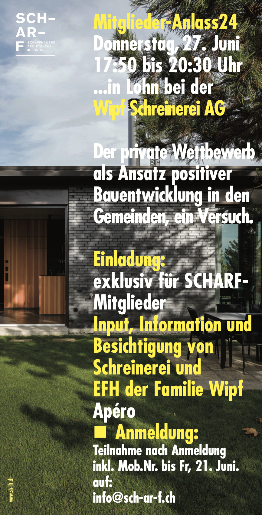 Die Teilnahme ist nur nach Anmeldung bis spätestens Freitag, 21. Juni möglich. Bitte schicken Sie uns eine Mail mit Angabe Ihrer Mobilnummer an: info@sch-ar-f.ch
