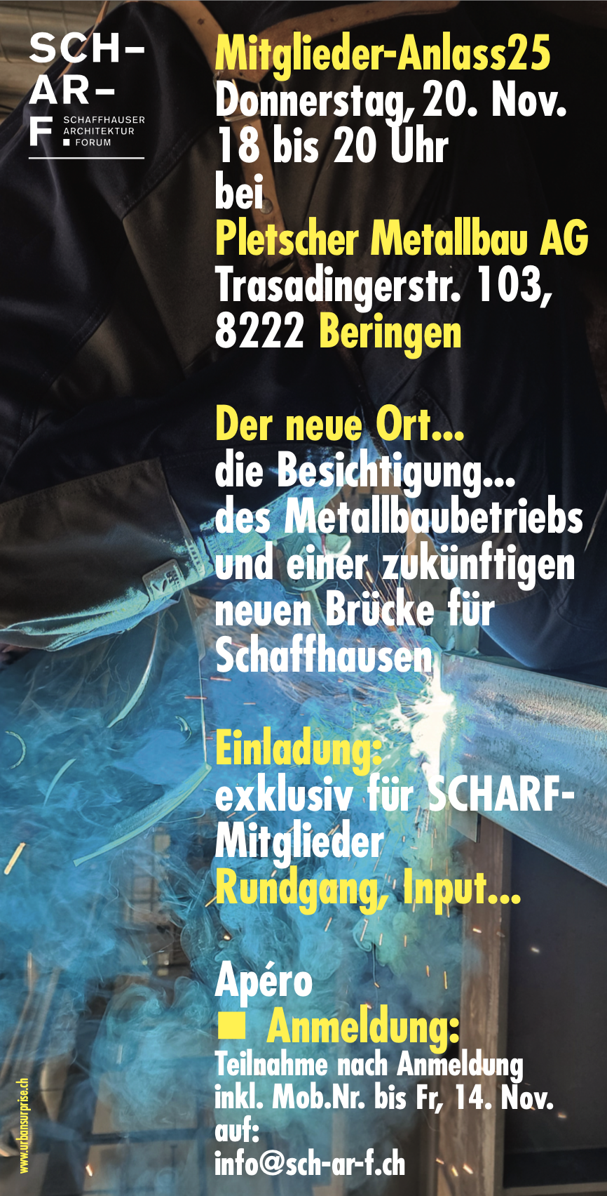 Die Teilnahme ist nur nach Anmeldung bis spätestens Freitag, 14. Nov. möglich. Bitte schicken Sie uns eine Mail mit Angabe Ihrer Mobilnummer an: info@sch-ar-f.ch