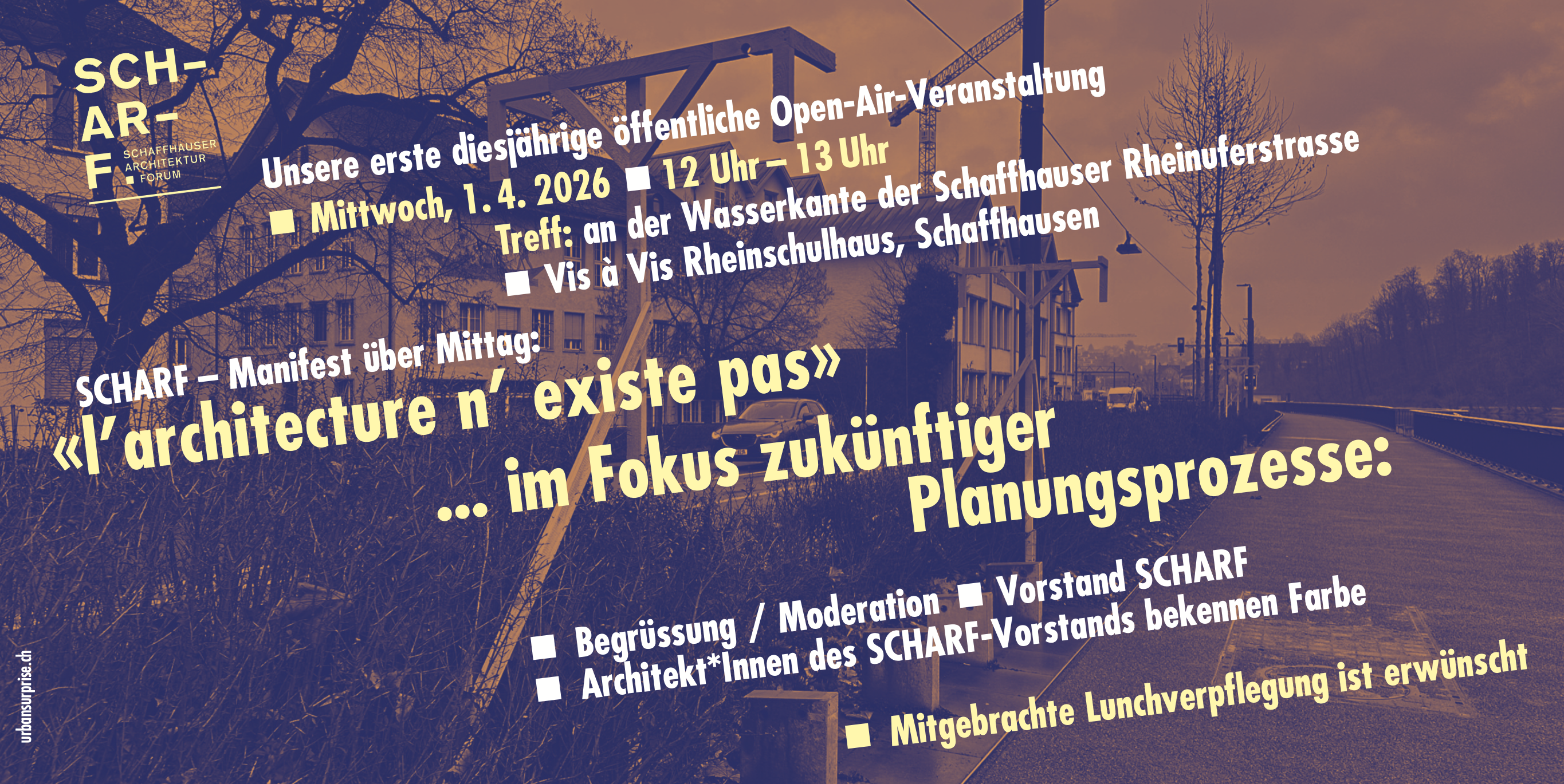 Mittwoch, 1. April 2026, 12.00 – 13.00 Uhr an der Wasserkante der Schaffhauser Rheinuferstrasse, vis à vis Rheinschulhaus Schaffhausen.