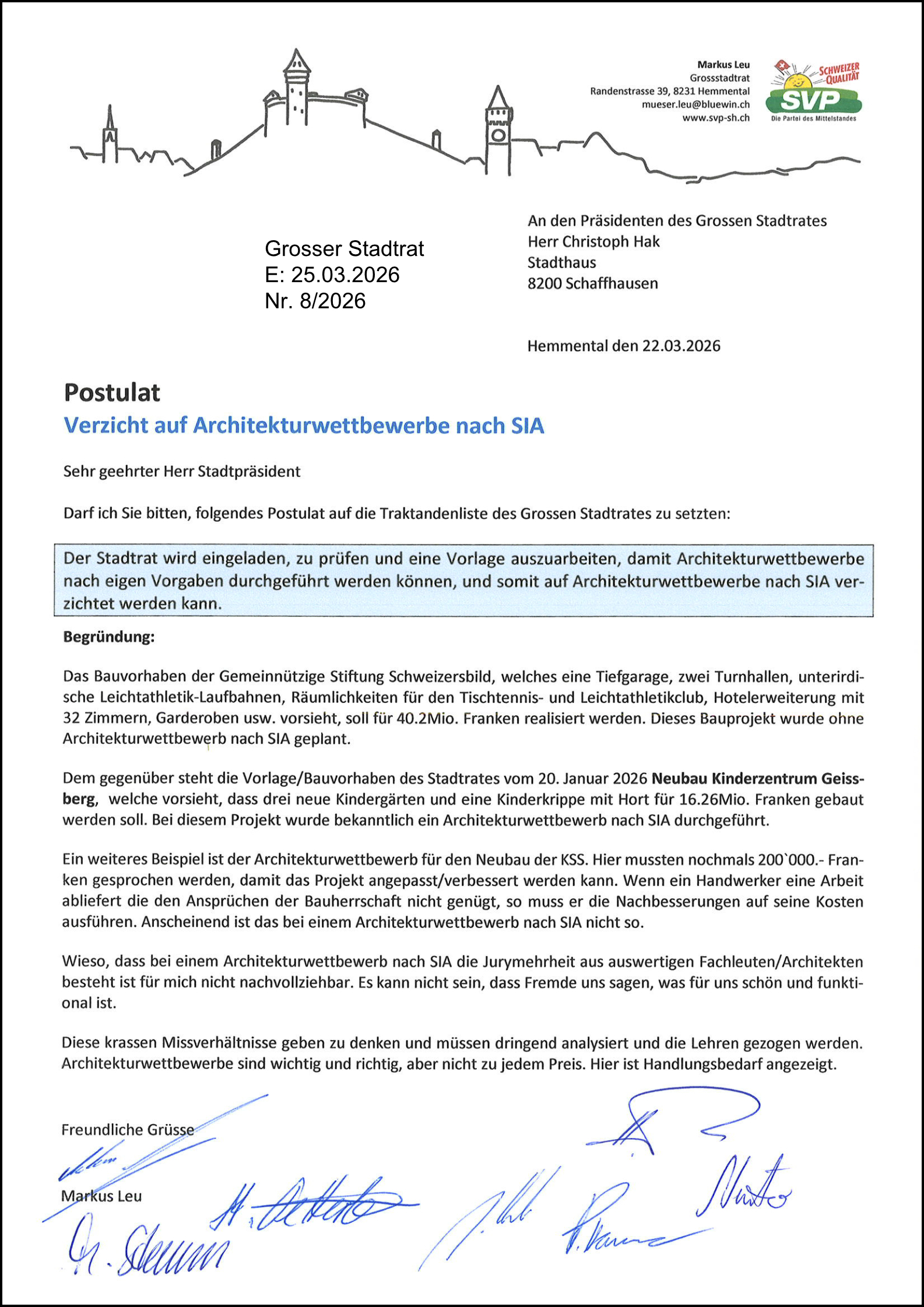 Das bezugnehmende Postulat der SVP Schaffhausen «Verzicht auf Architekturwettbewerbe nach SIA»: https://www.stadt-schaffhausen.ch/postulate/2815567
