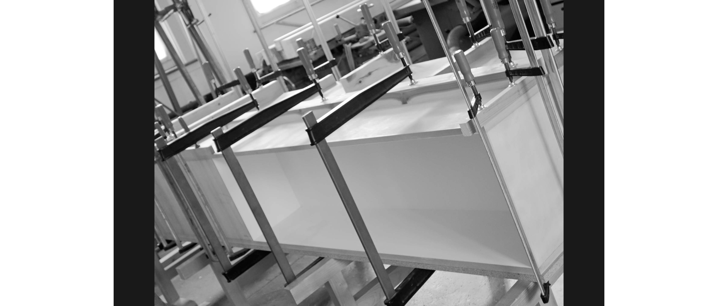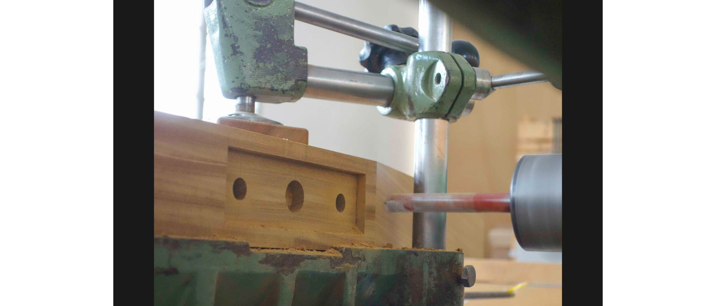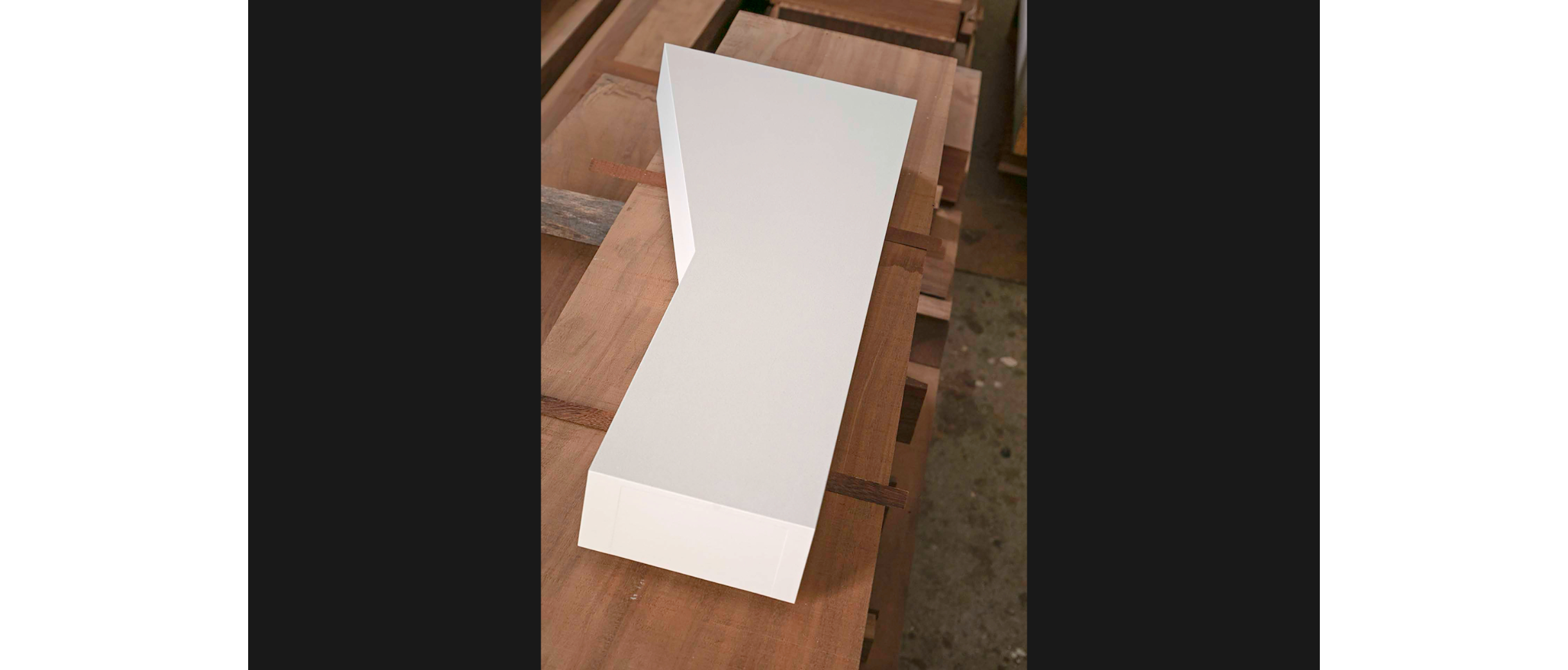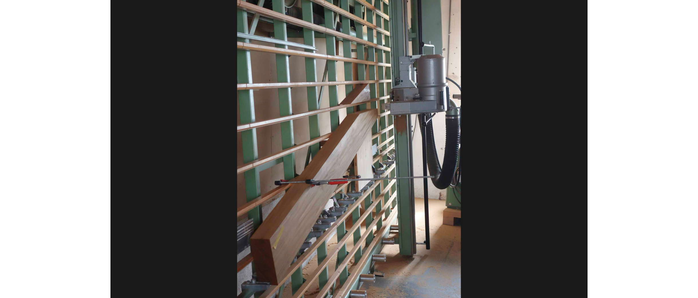 Köhle arbeitet in seiner Werkstatt mit traditionellen Maschinen, nicht aus nostalgischen Gründen, sondern weil er sie verhältnismässig günstig erstehen konnte und selbst wieder fit gemacht hat. In den 80ern, als er die Lehre machte, war die «Striebig» – eine Schweizer Erfindung – der Goldstandard für gerade Schnitte und rechte Winkel. Heute ist sie weitgehend von CNC-Fräsen ersetzt worden. Köhle nutzt seine «Striebig» auch mal unkonventionell und spannt ein Brett diagonal ein. Wäckerlin eröffnet eine neue Perspektive auf Köhles reduzierten Maschinenpark: Liegt in dieser selbstgewählten Beschränkung nicht gerade der Ursprung seiner Kreativität?