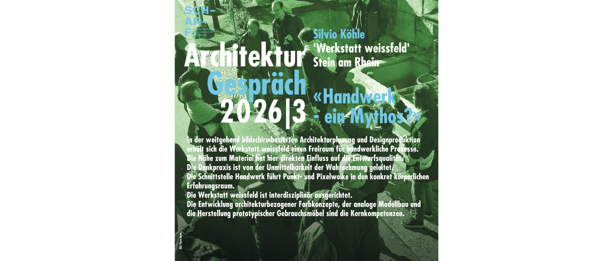 Köhle sammelt Abschnitthölzchen und nutzt sie, um zwischen den Aufgaben des Tagesgeschäfts Ideen räumlich aufzuskizzieren. Die hellen Streifen am Rand eines Teakbretts zum Beispiel werden abgeschnitten, weil sie nicht wetterfest sind. Köhle fügt sie zusammen: Acht Hölzli, gestapelt. Mit dem Fixieren geht das Spontane und Vorübergehende verloren, der Entwurf wird zum Objekt. Wäckerlin greift Richard Sennet auf, der das Handwerk als den Wunsch bezeichnete, eine Tätigkeit um ihrer selbst willen gut zu machen. Die Langsamkeit, die intensive Auseinandersetzung mit dem Material, die Möglichkeit, einen Entwurf noch in der Fertigung anzupassen – die Art, wie Köhle arbeitet, weckt Sehnsüchte bei den anwesenden Architektinnen und Architekten.