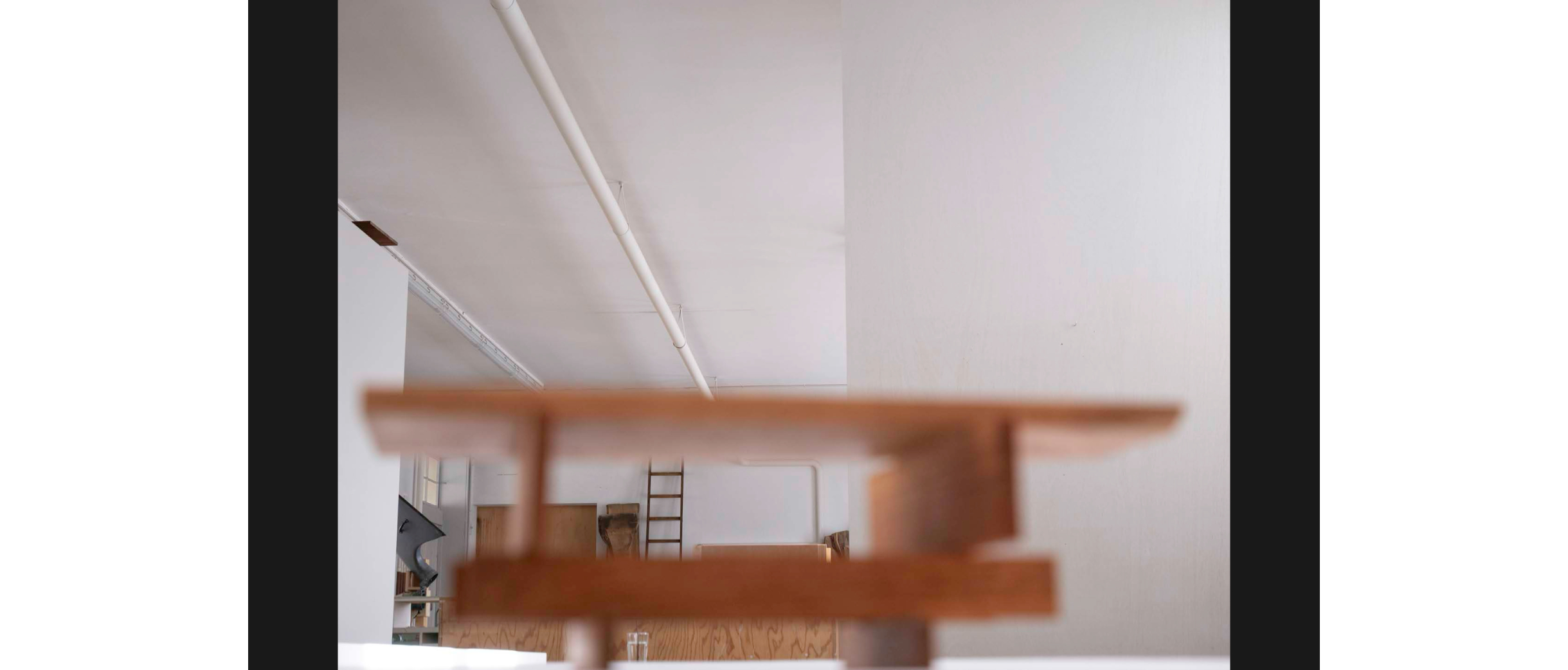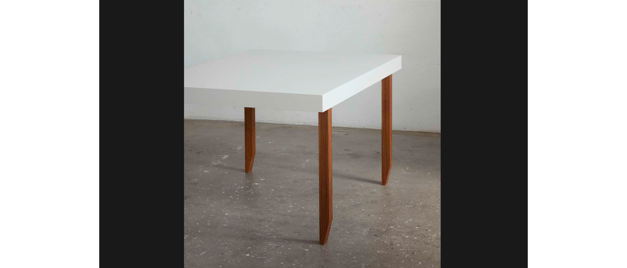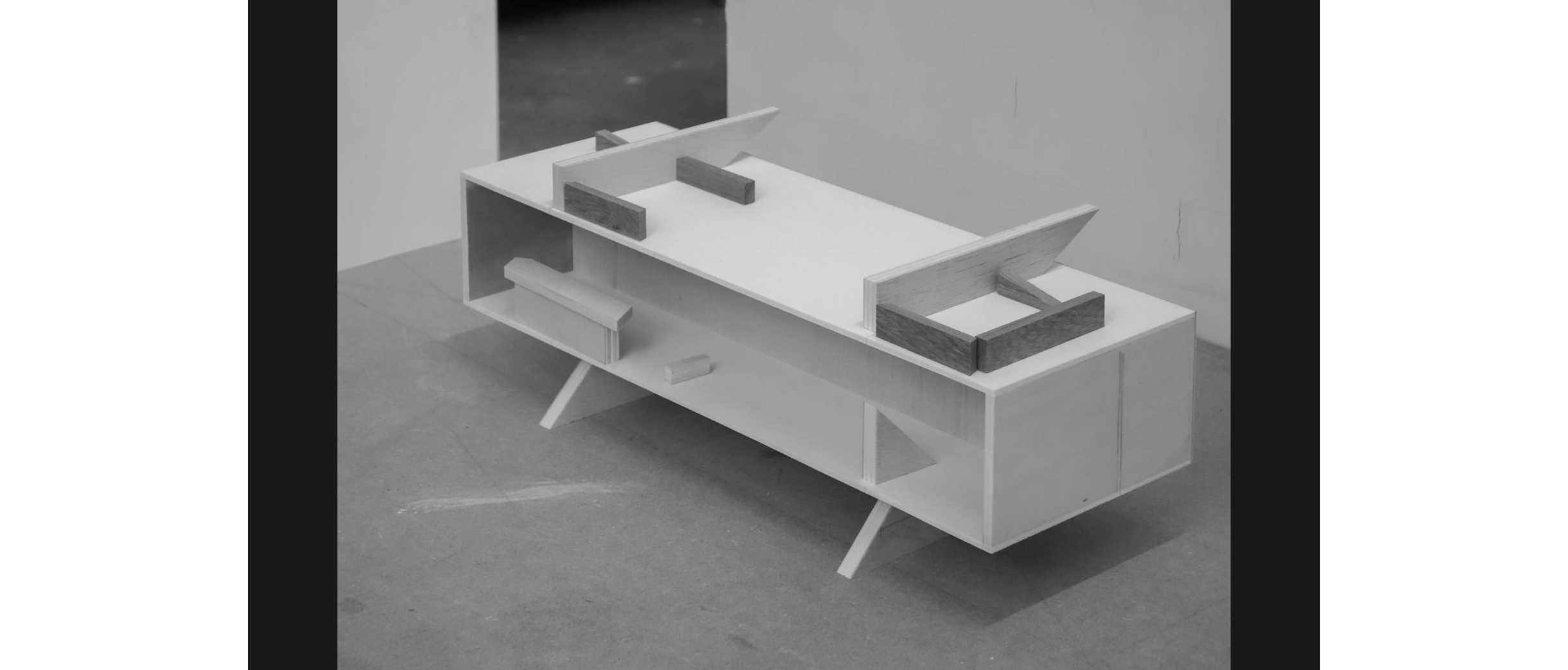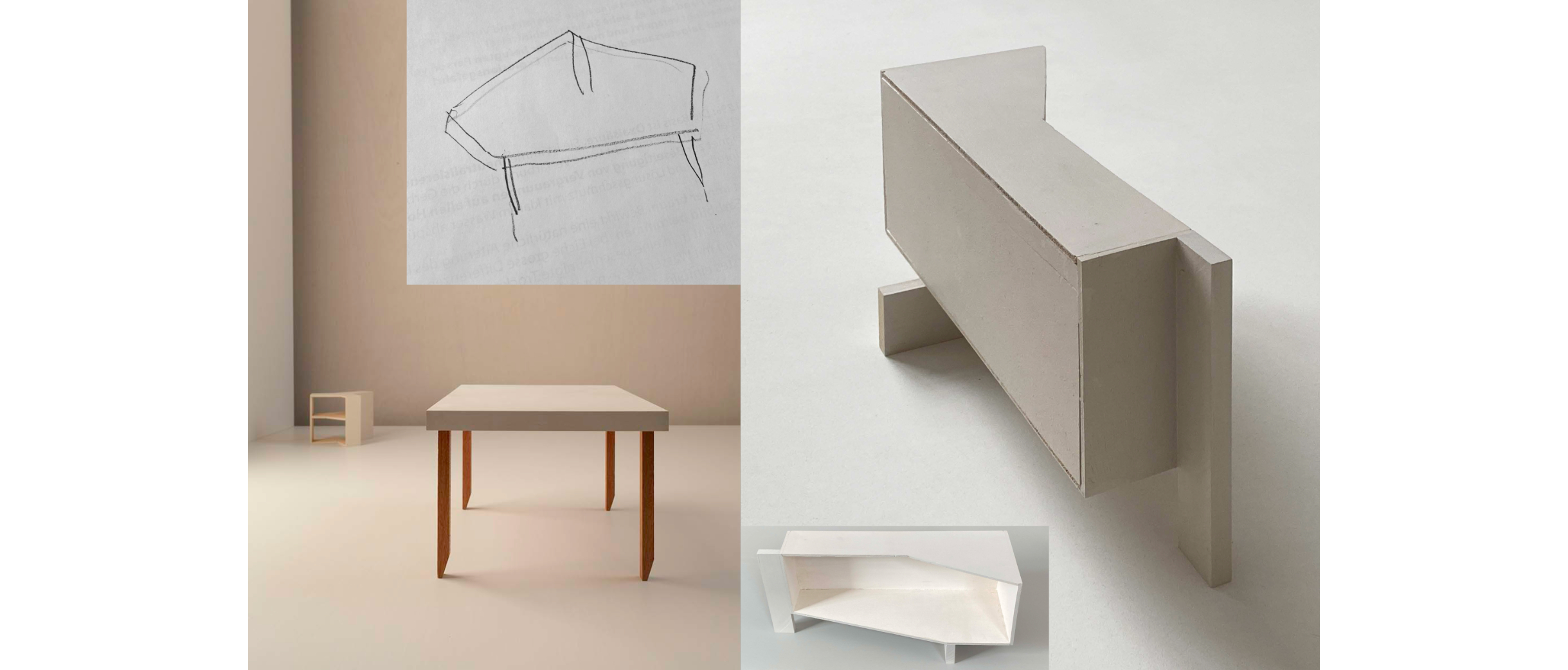 Wie unterschiedlich sich das Motiv des Tisches interpretieren lässt, zeigt das nächste Projekt. Vom Horizontalen führt er ins Vertikale: Eine abstrakte, hohle Platte, ein Farbträger, wie Köhle sie nennt, steht auf vier Beinchen, die unten angeschrägt sind. Wäckerlin sieht sofort Gazellenfüsschen, jederzeit bereit, loszurennen. Diese Art kastenartige Hohlkörper beschäftigt Köhle, es ermöglicht ein Objekt im Raum, mit rechten Winkeln oder freier, polygonal, mit oder ohne Nutzung, ein Tisch, ein Regal, oder als Selbstzweck.