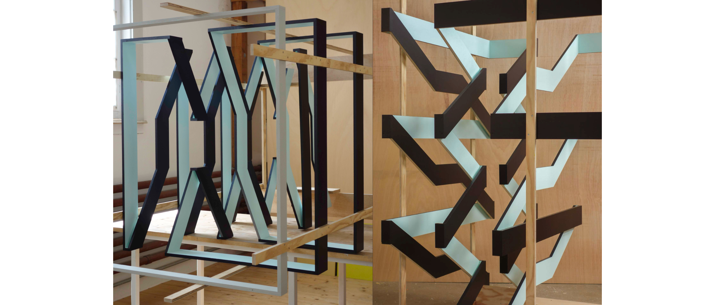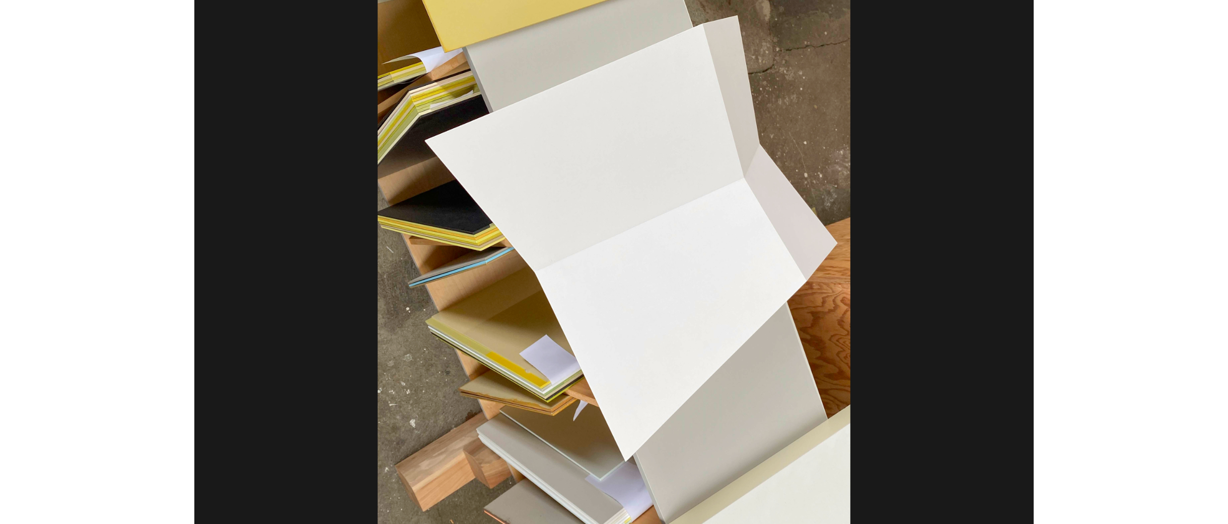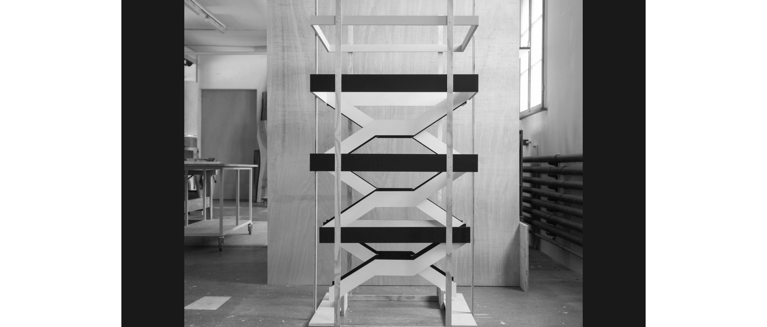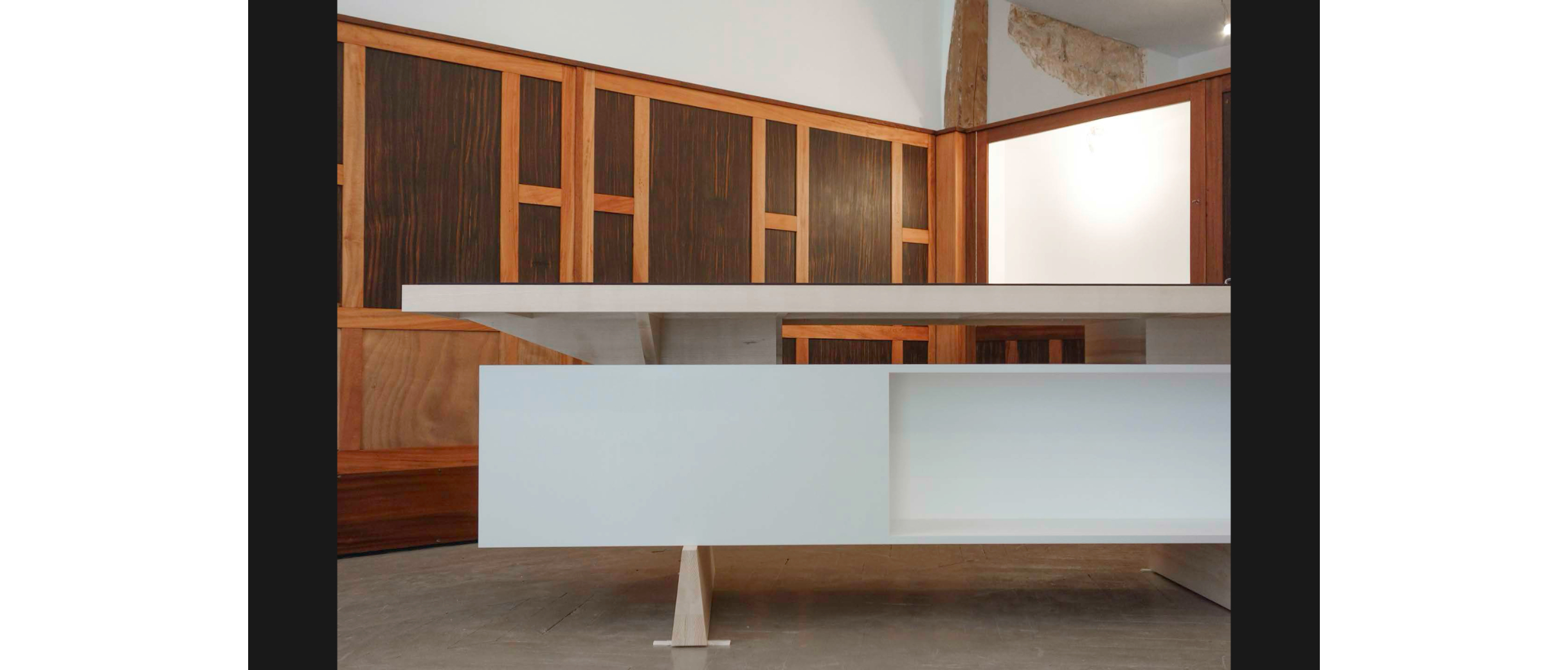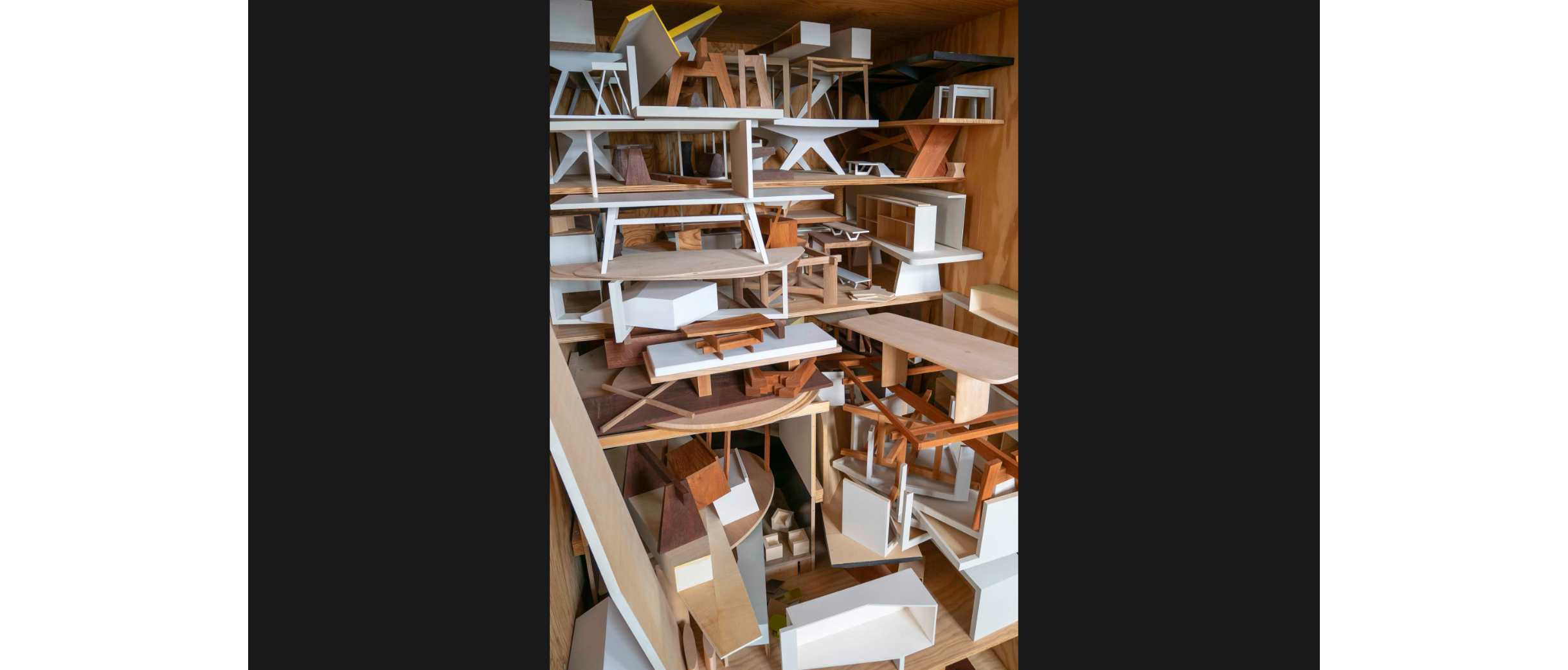 Wie unterschiedlich sich das Motiv des Tisches interpretieren lässt, zeigt das nächste Projekt. Vom Horizontalen führt er ins Vertikale: Eine abstrakte, hohle Platte, ein Farbträger, wie Köhle sie nennt, steht auf vier Beinchen, die unten angeschrägt sind. Wäckerlin sieht sofort Gazellenfüsschen, jederzeit bereit, loszurennen. Diese Art kastenartige Hohlkörper beschäftigt Köhle, es ermöglicht ein Objekt im Raum, mit rechten Winkeln oder freier, polygonal, mit oder ohne Nutzung, ein Tisch, ein Regal, oder als Selbstzweck.