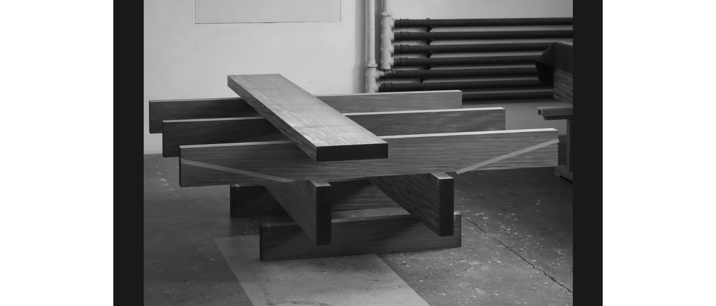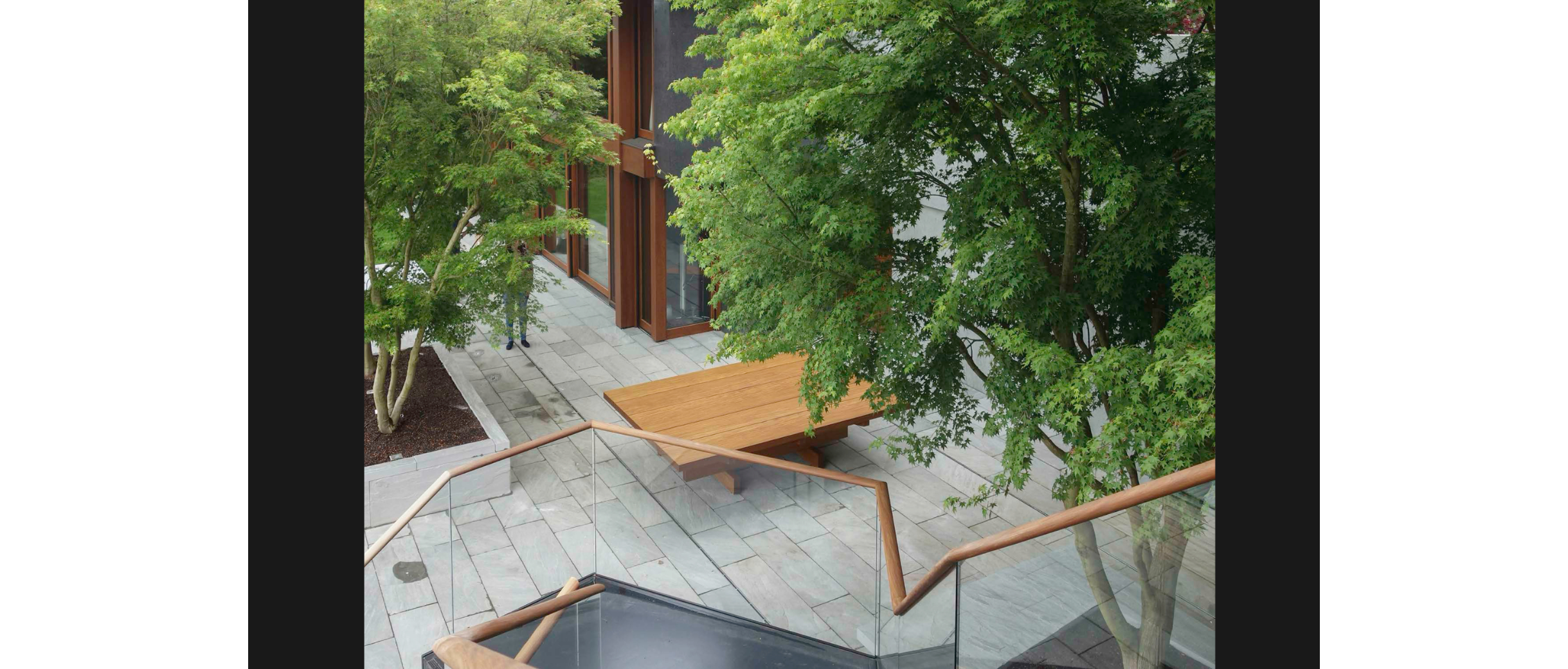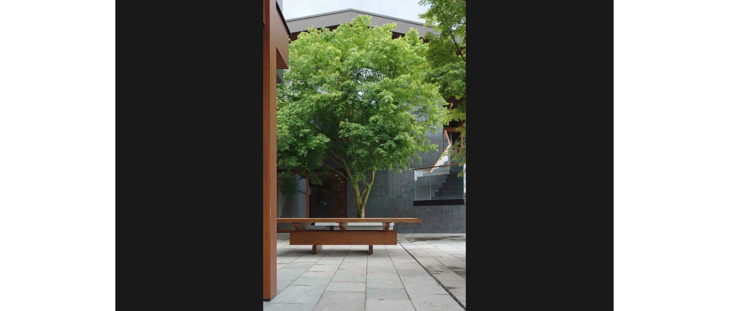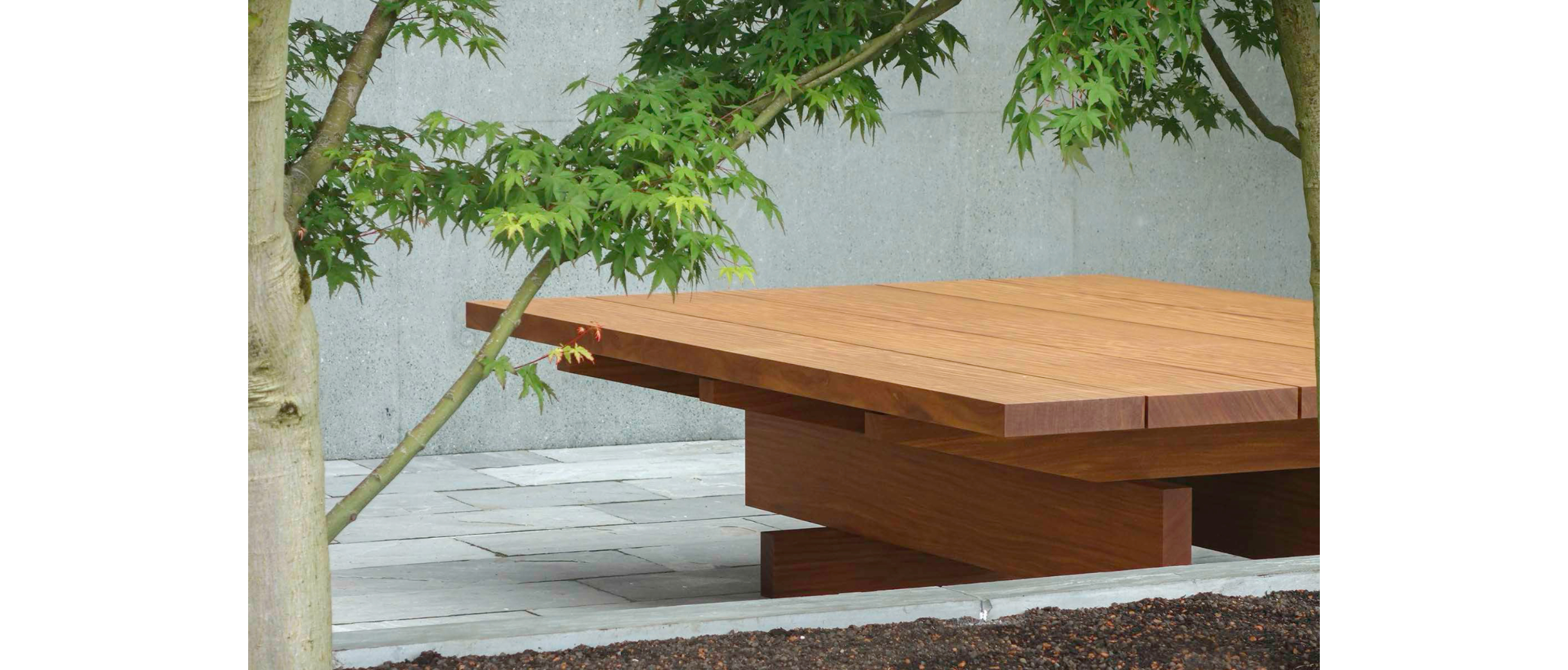 Aus den Acht Hölzli entwickelte Köhle einen Tisch für den Innenhof. Von der Seite wirkt er beinahe filigran, die kreuzweise aufeinanderliegenden Bretter erlauben unerwartete Durchblicke. Erst von der expressiven Treppe her wird seine wahre Grösse und seine Massivität sichtbar. Das warme Teakholz nimmt Bezug auf die Architektur und bildet eine wohltuende Pause zur Sichtbetonfassade und dem grauen Terrassenboden.
