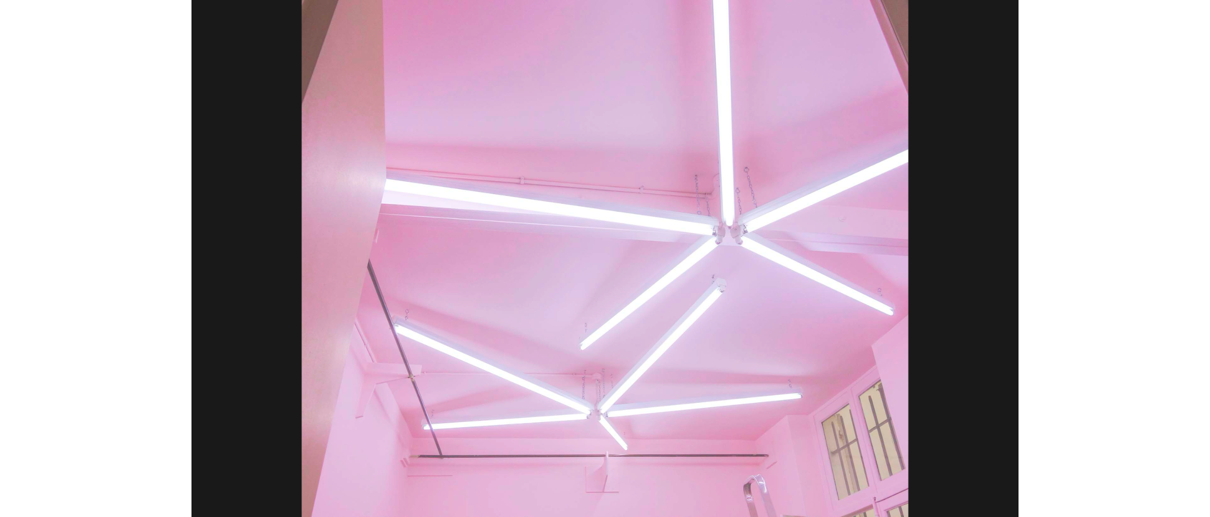 Eine Kombination aus Hohlkörper, schwebender Tischplatte und zwei konisch zulaufenden Kanthölzern als Unterbau kam für einen besonderen Auftrag in Paris zum Einsatz: Ein junger Schneider richtete sein Atelier ein, in dem er Anzüge nach Mass fertigt. Köhles Tisch steht selbstbewusst im Raum, die Esche vom Zürichsee ein heller Kontrast zum Mahagony und Rio-Palisander des Täfers, mit stoffbezogener Tischplatte, zur Wand hin funktioniert er als Werkbank, zum Raum als Showcase. Der Schreiner und der Schneider, so unterschiedlich ihre Tätigkeiten auf den ersten Blick erscheinen mögen, so gleich ist ihre Einstellung zum Handwerk. In der Mitte standen die Architekten, die das Atelier mit einem frischen Verständnis zu Denkmalpflege für die neue Nutzung transformierten. Im «Backstage» kommt dafür Köhles weitere Expertise zum Einsatz. Die sternförmig angeordneten Leuchtröhren erlauben eine gleichmässige Ausleuchtung des Raums, die rosa Farbgebung taucht den Raum in eine beinahe traumartige Atmosphäre.
