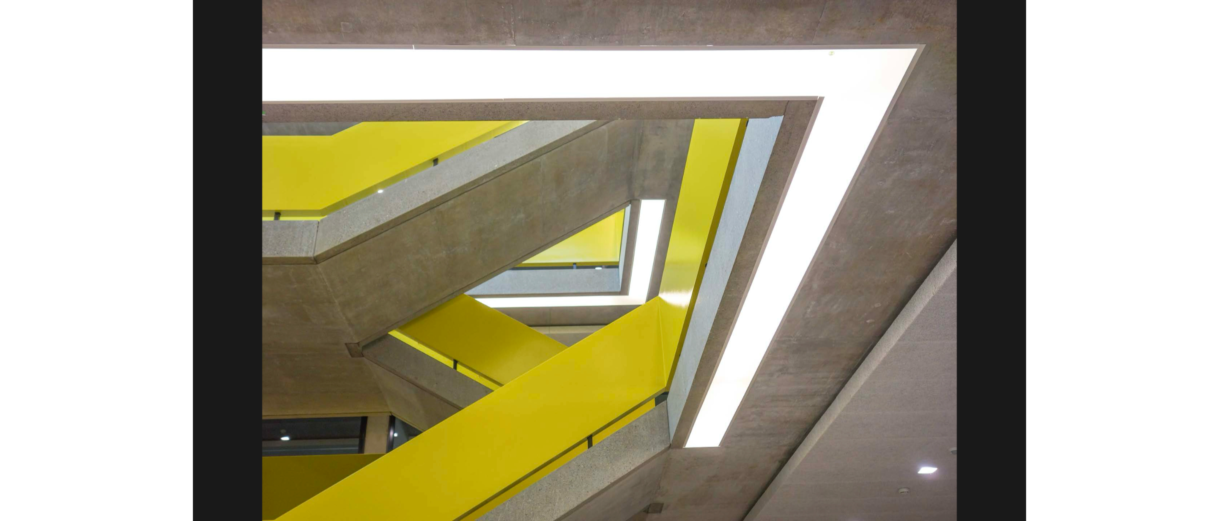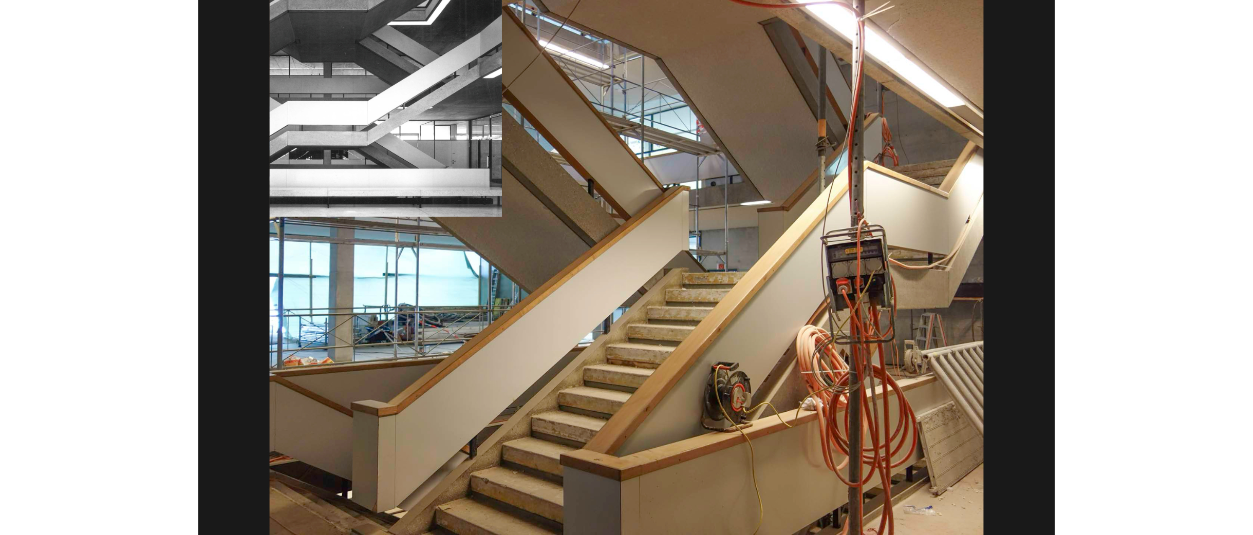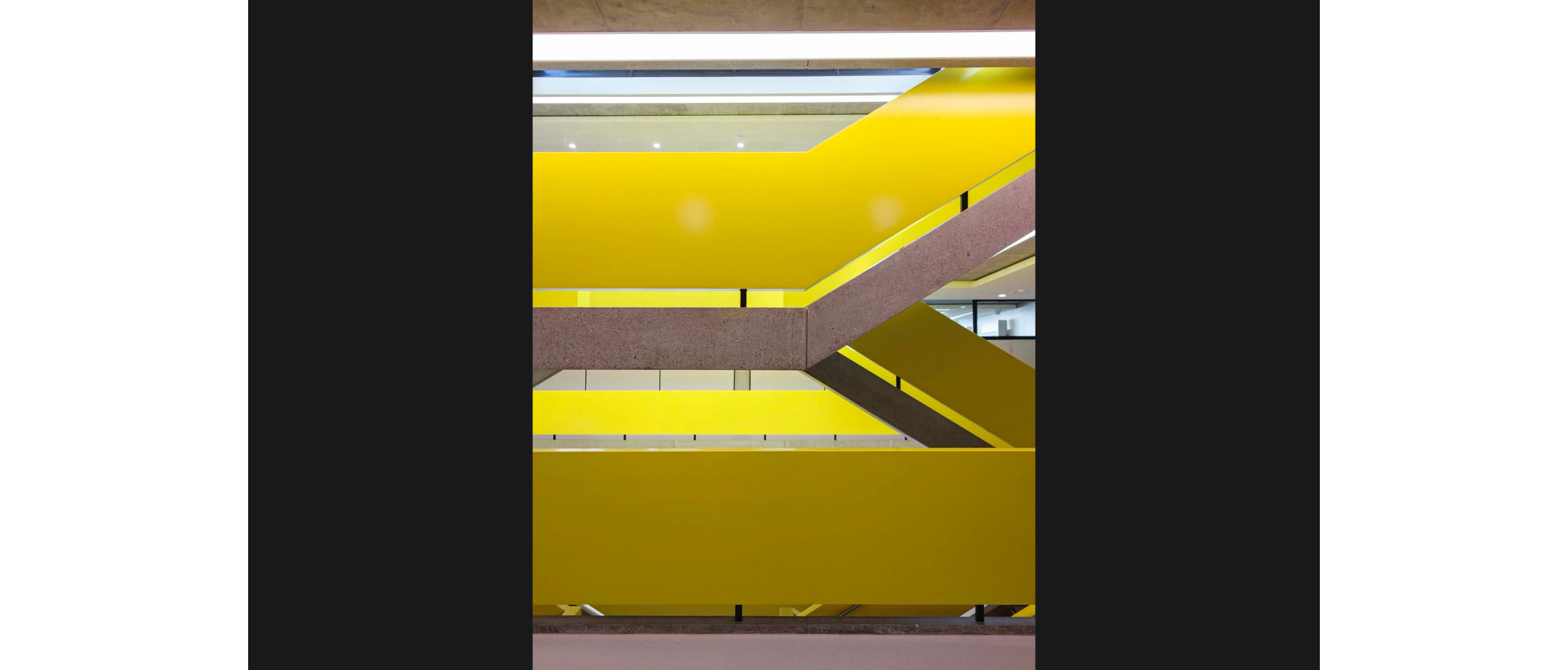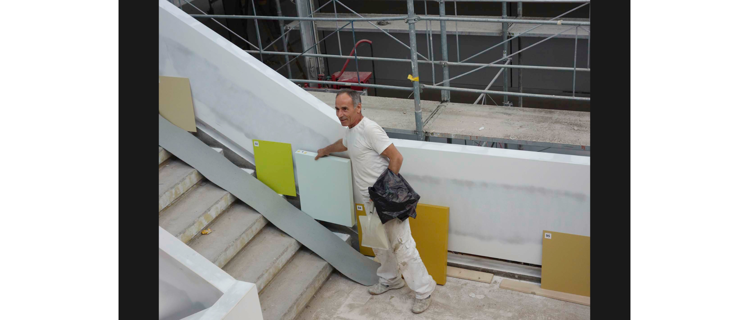 Das Modell ermöglichte einen frischen Blick auf das Projekt. In der Überarbeitung verschwand der Holzhandlauf zugunsten eines monolithischeren Ausdrucks, die Erhöhung wurde im trockenbau und fugenlos umgesetzt – in einer Illusion von Beton, ganz so, wie es die Architekten ursprünglich gewünscht hatten, aber aufgrund des Gewichts nicht umsetzen konnten. Köhle brachte verschiedene Gelbmischungen vor, nach ausgiebiger Bemusterung auf der Baustelle einigten sich die Bauherrschaft, Denkmalpflege und Architekten auf ein leuchtendes Signalgelb. Das Geländerband in glänzender Farbe bildet ein Highlight im reduzierten Sichtbeton. Köhle berichtet von der Begeisterung des Malers, der nach monatelangem Spachteln etwas anderes als grau streichen durfte – die geteilte Freude am Handwerk.