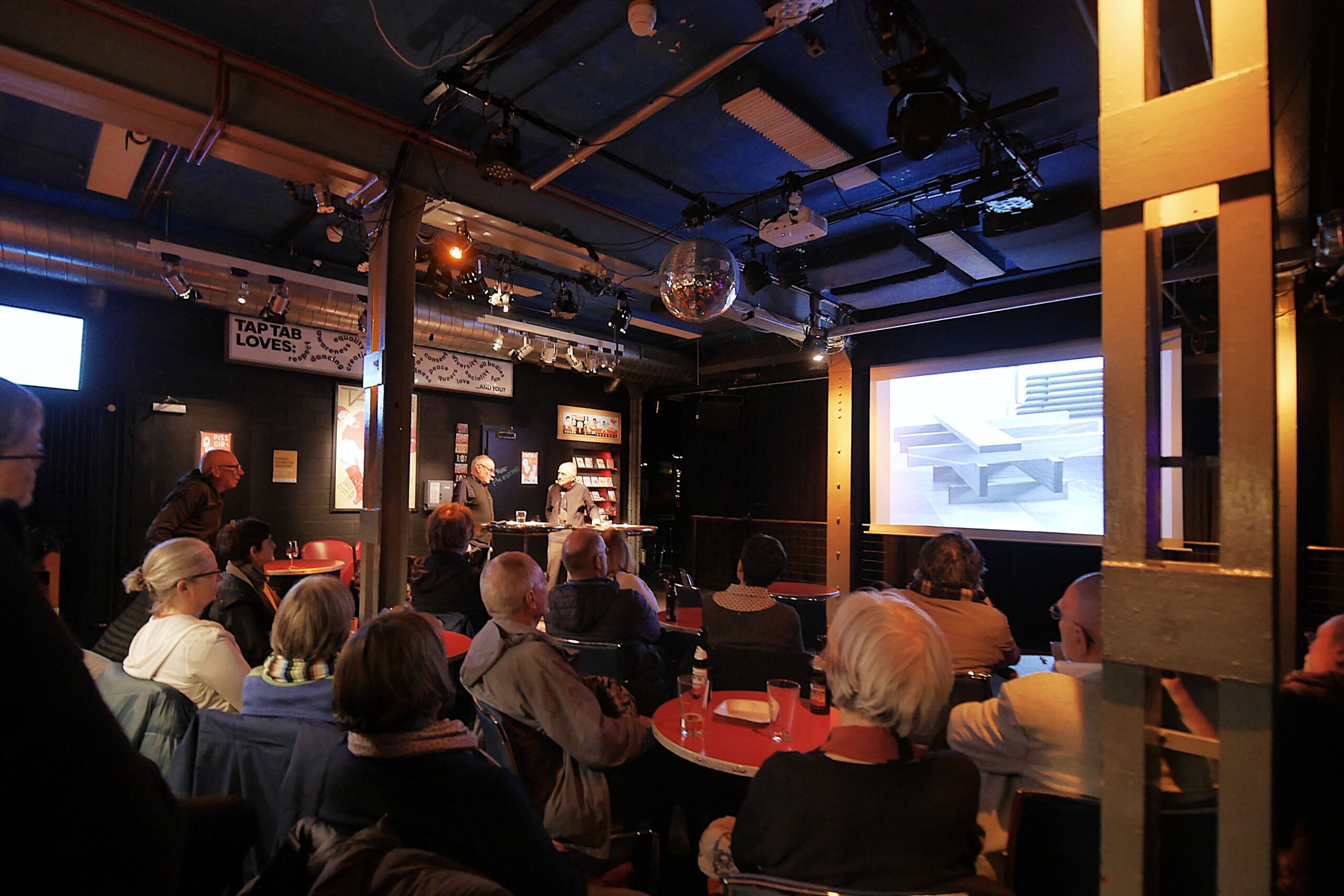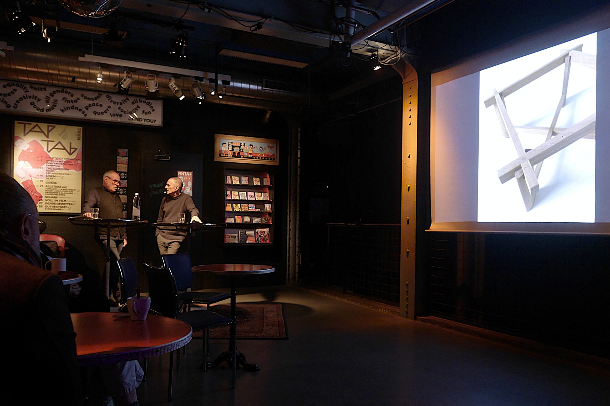Der Vortrag beginnt mit einem Schweigen. Auf Christian Wäckerlins Bitte, Silvio Köhle soll doch ein paar Worte zu sich und seinem Werdegang erzählen, hält dieser zunächst inne. Schnell wird klar, dass Köhle lieber sein Werk sprechen lässt.